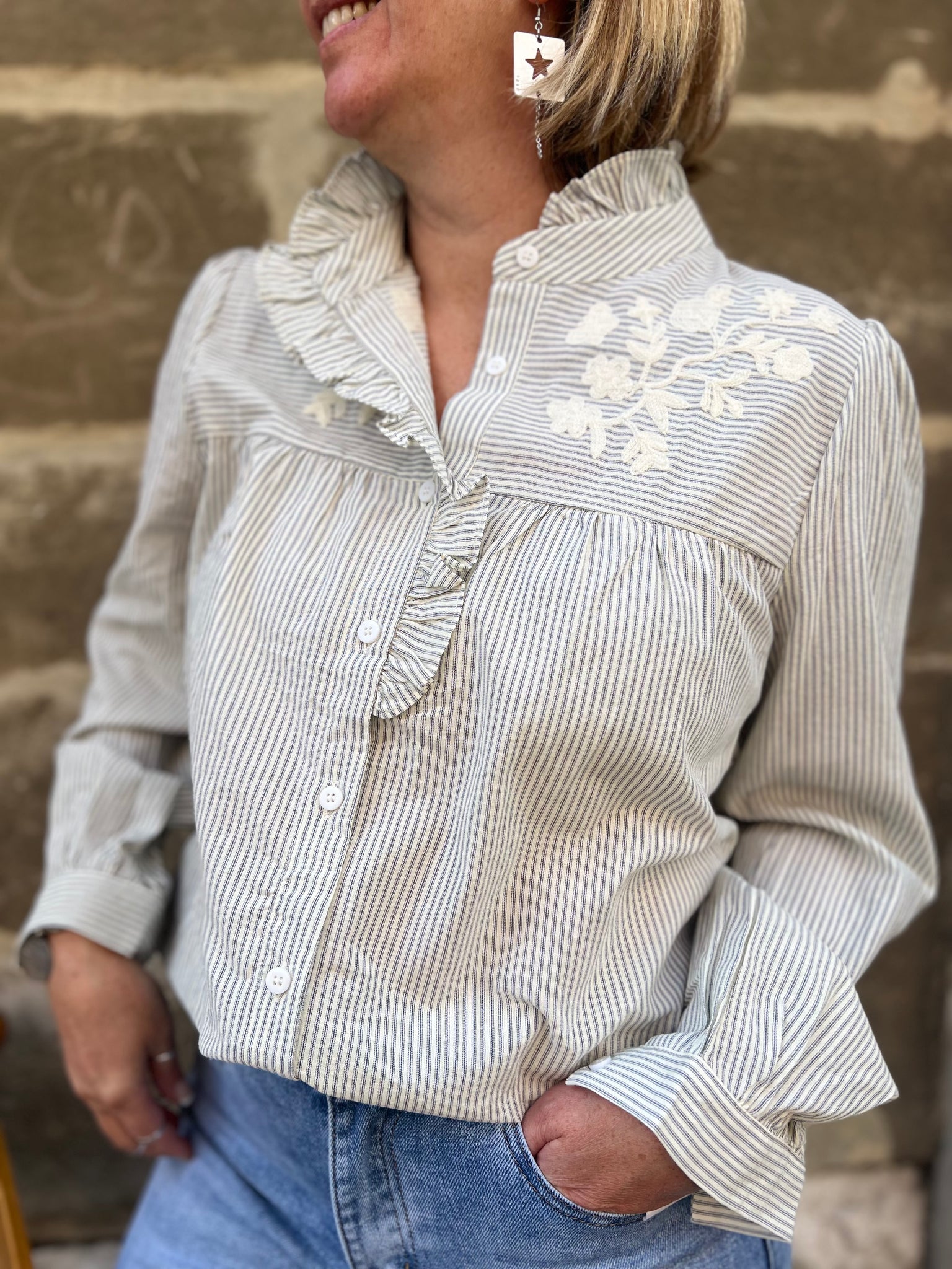 Blouse rayée bleu et blanc cassé, détails brodés blanc cassé.