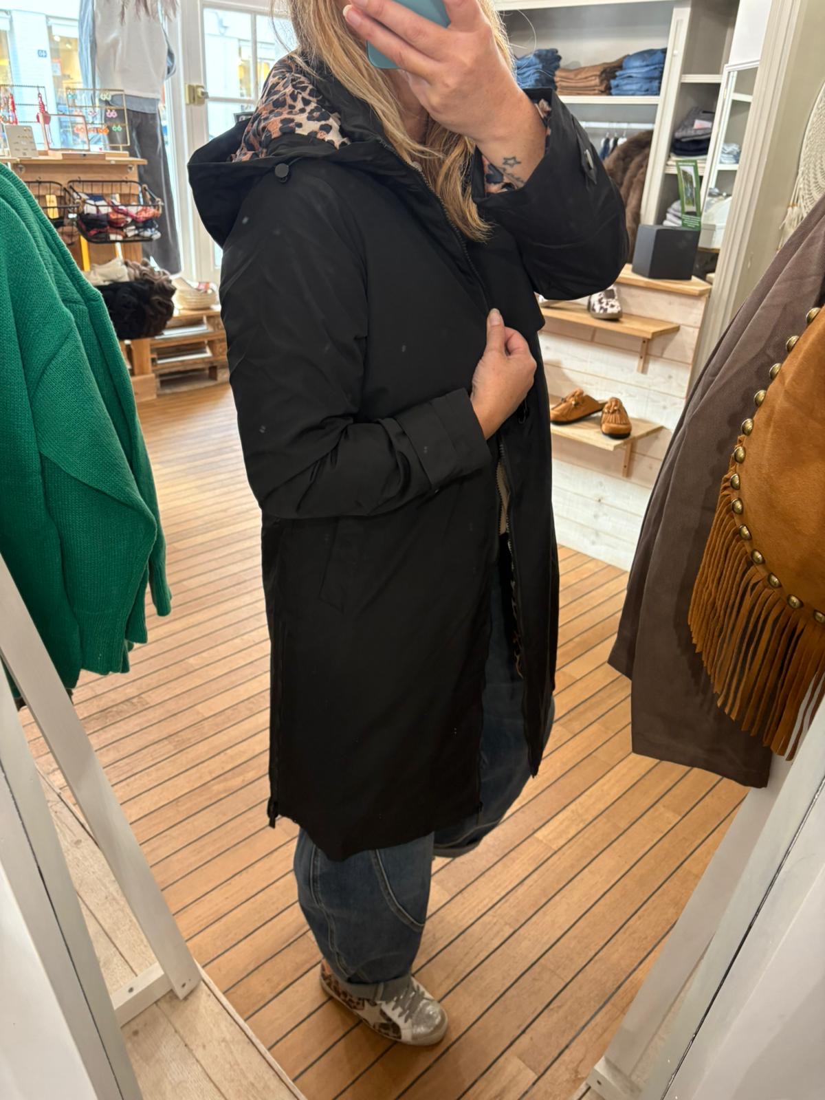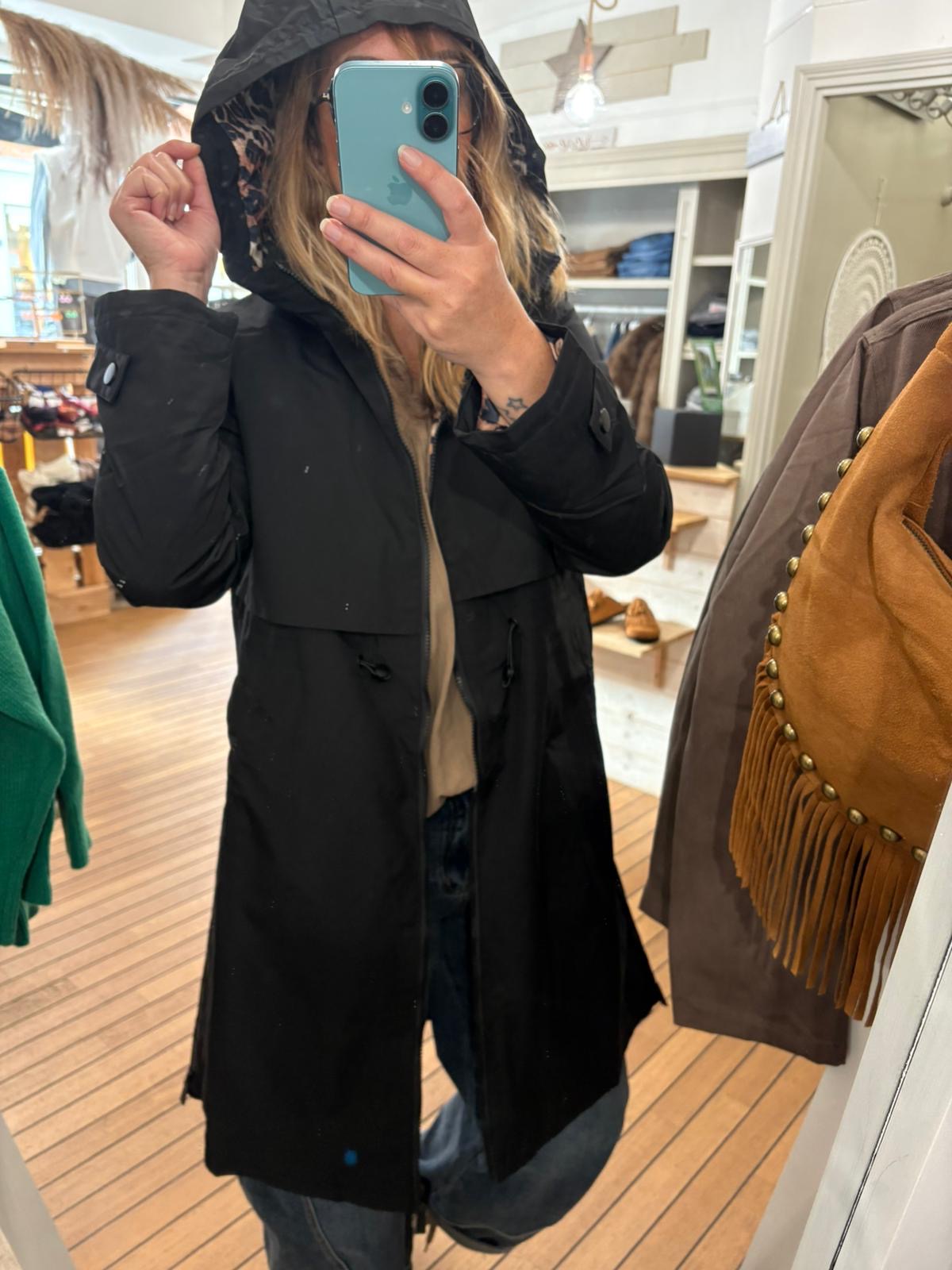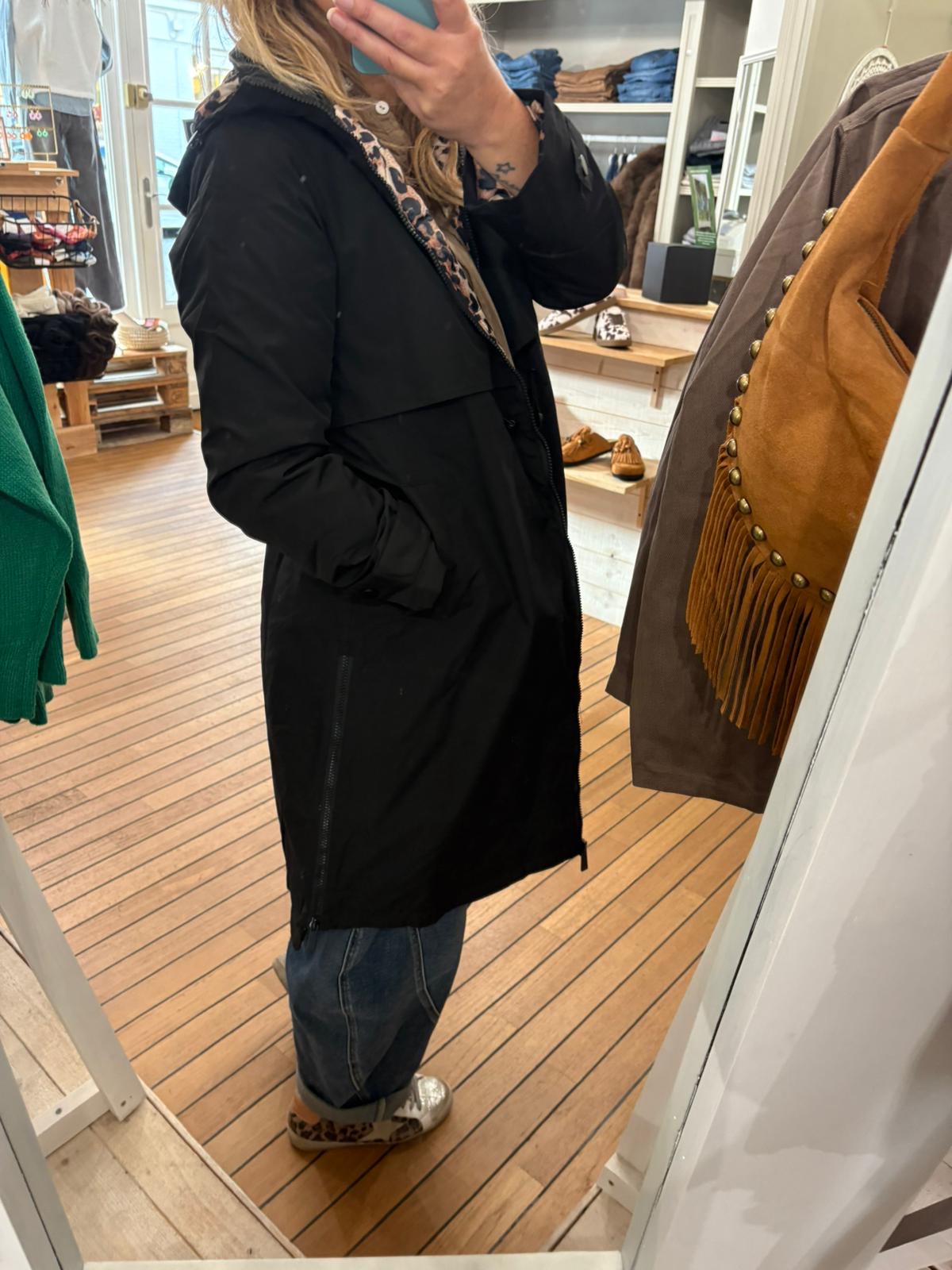Imperméable de couleur noire, intérieur imprimé léopard.