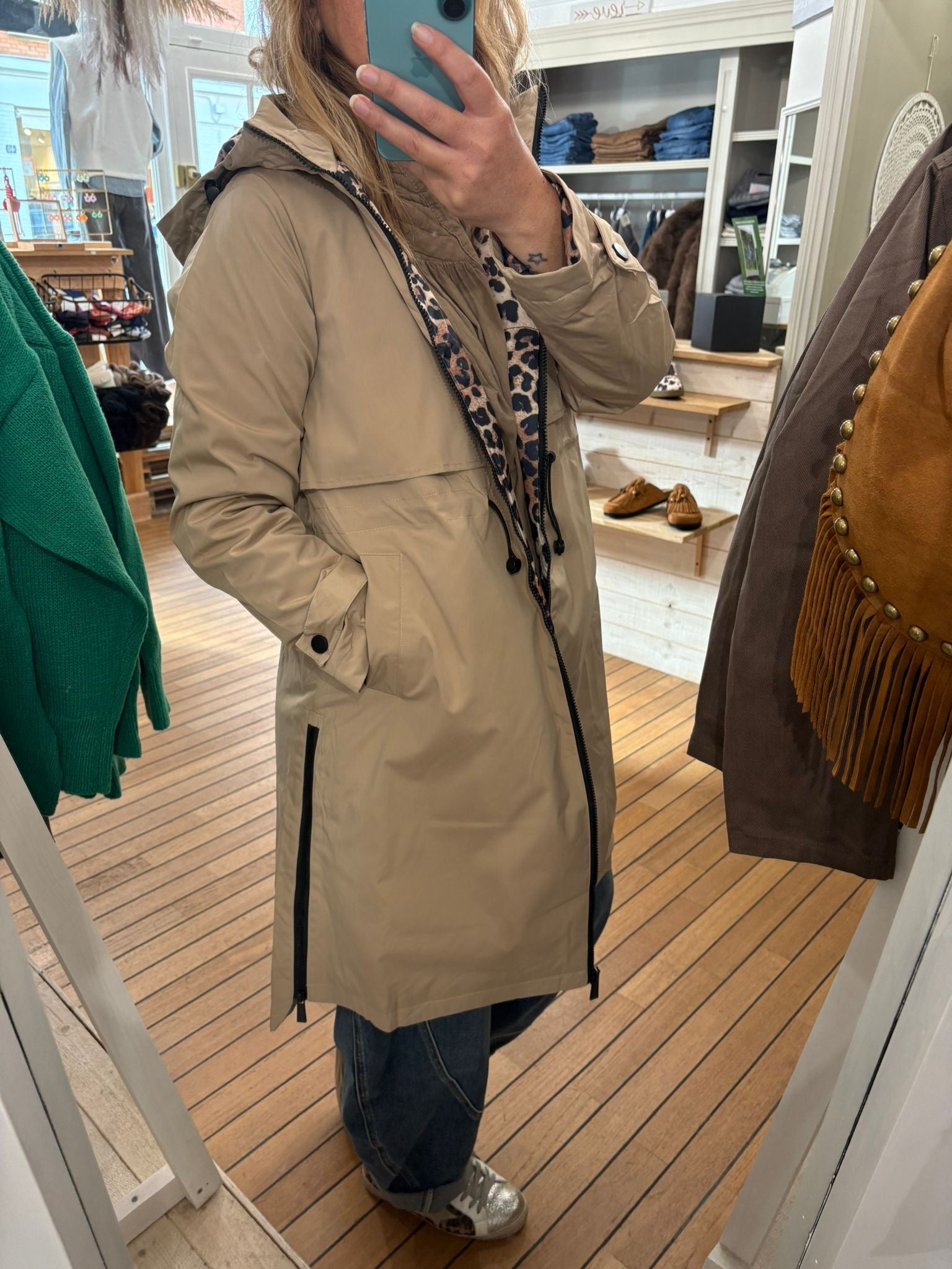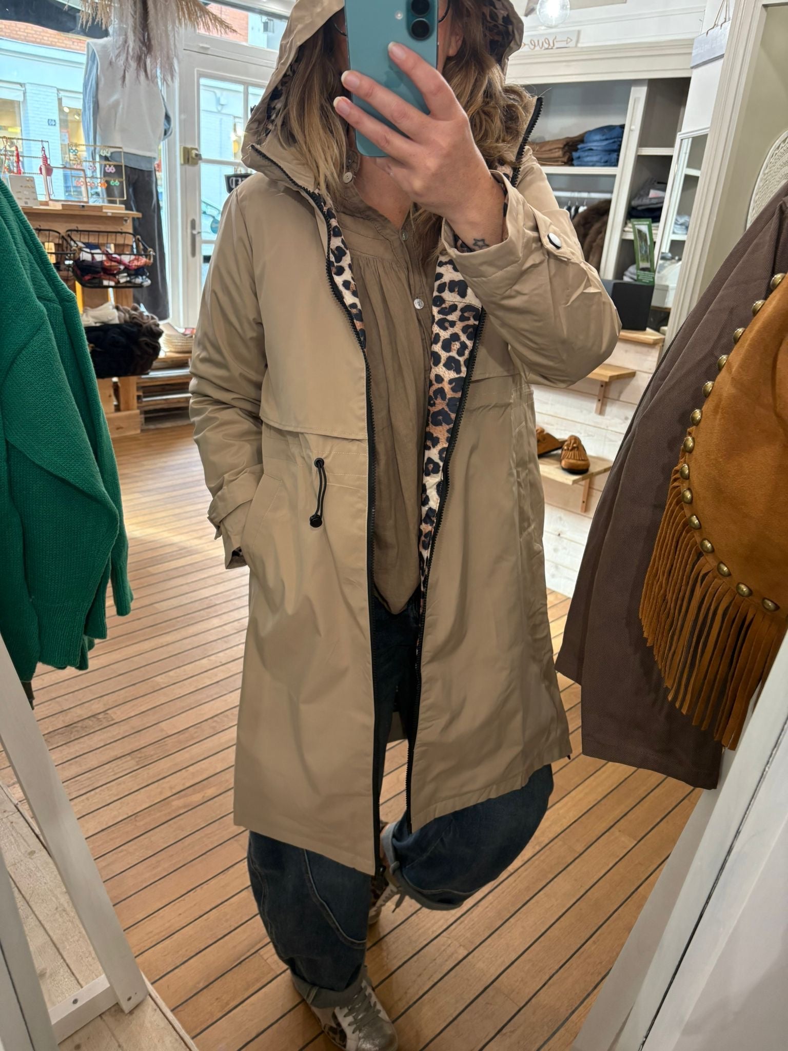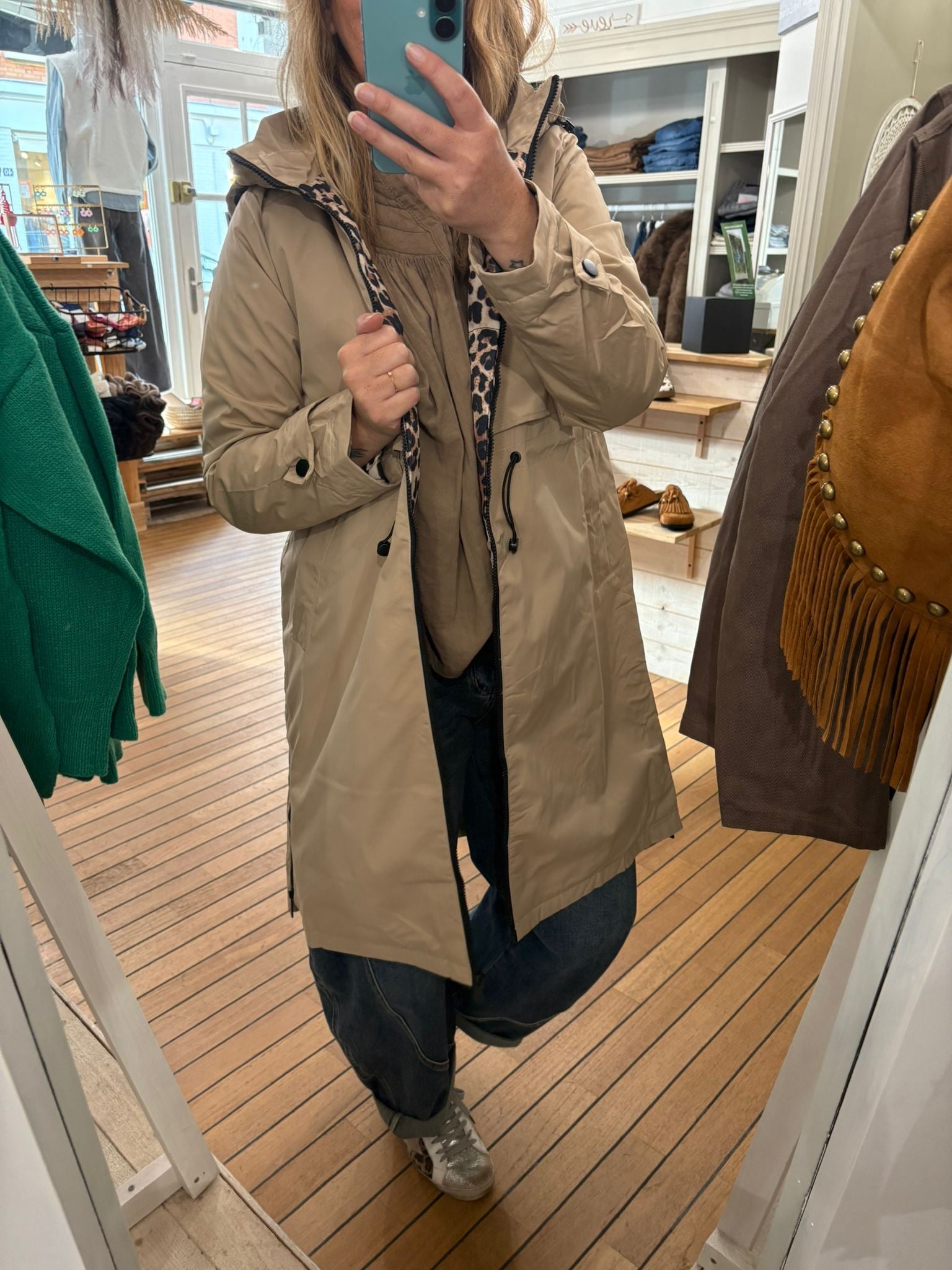 Imperméable de couleur beige, intérieur imprimé léopard.
