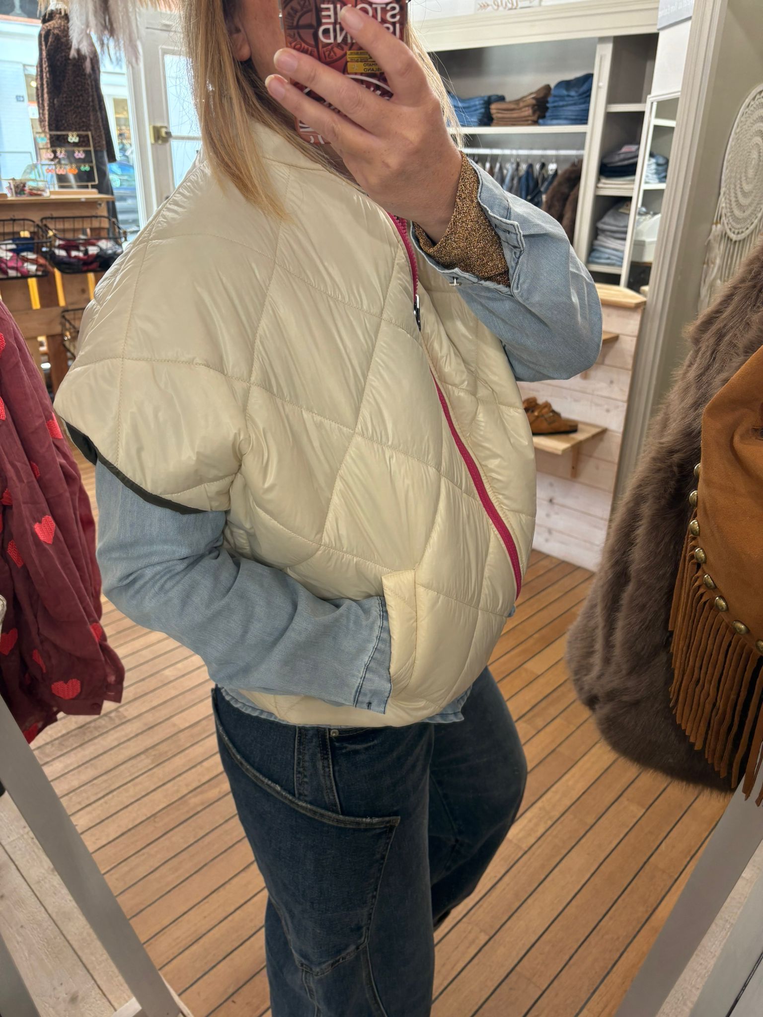 Veste réversible sans manches, détails matelassés sur un côté, zip de couleur vert fluo ou rose fluo ( selon le coloris choisi).