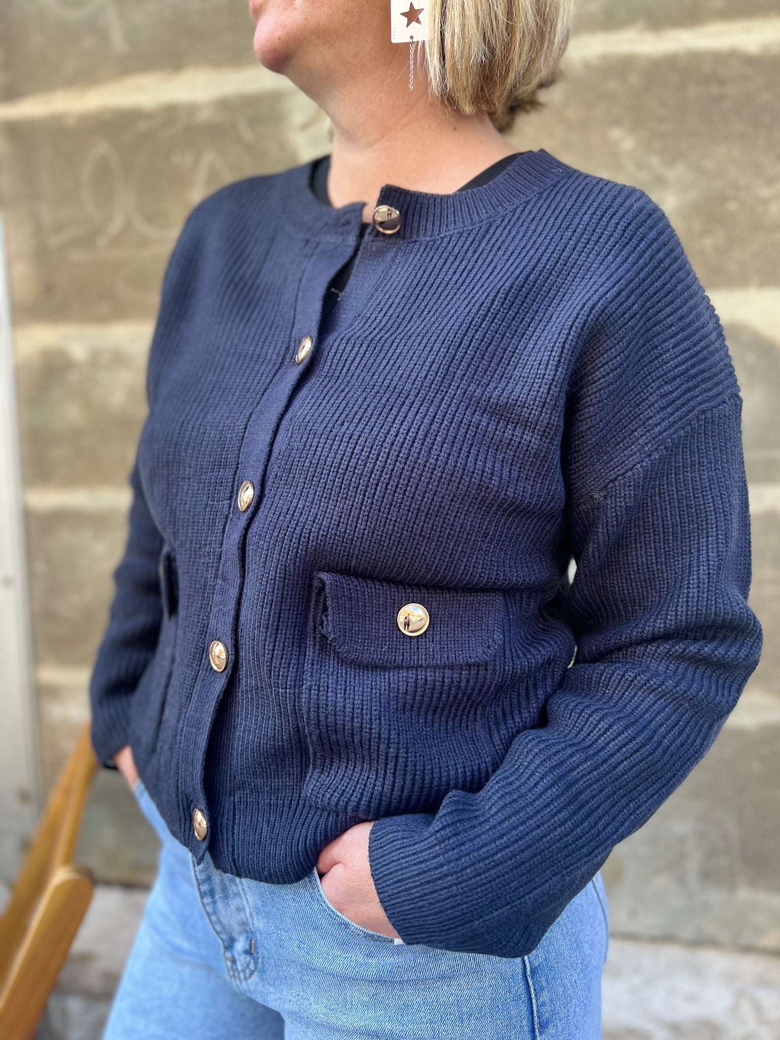 Pull / Gilet côtelé, col rond, poches sur le devant, détails boutons dorés.