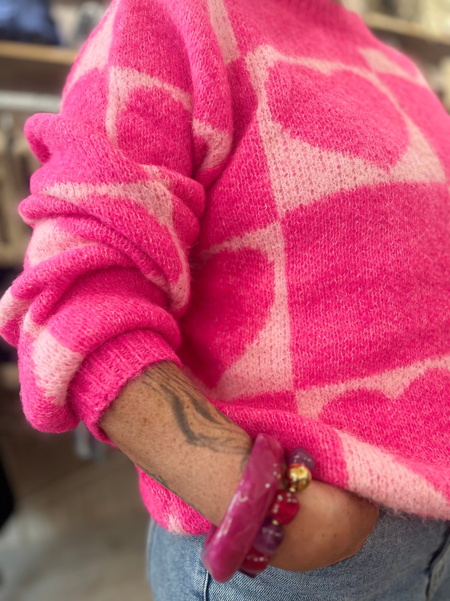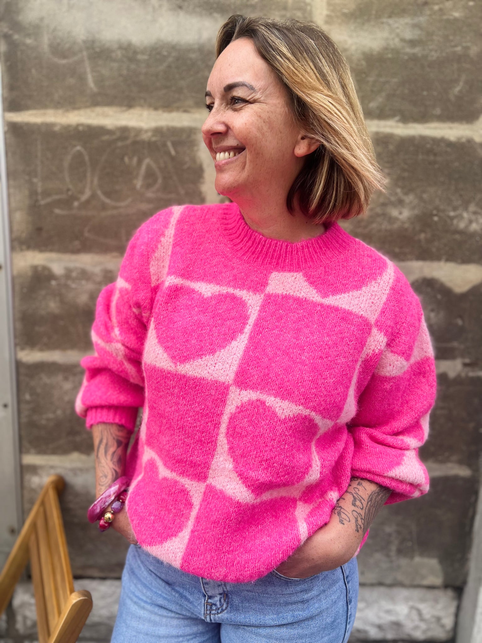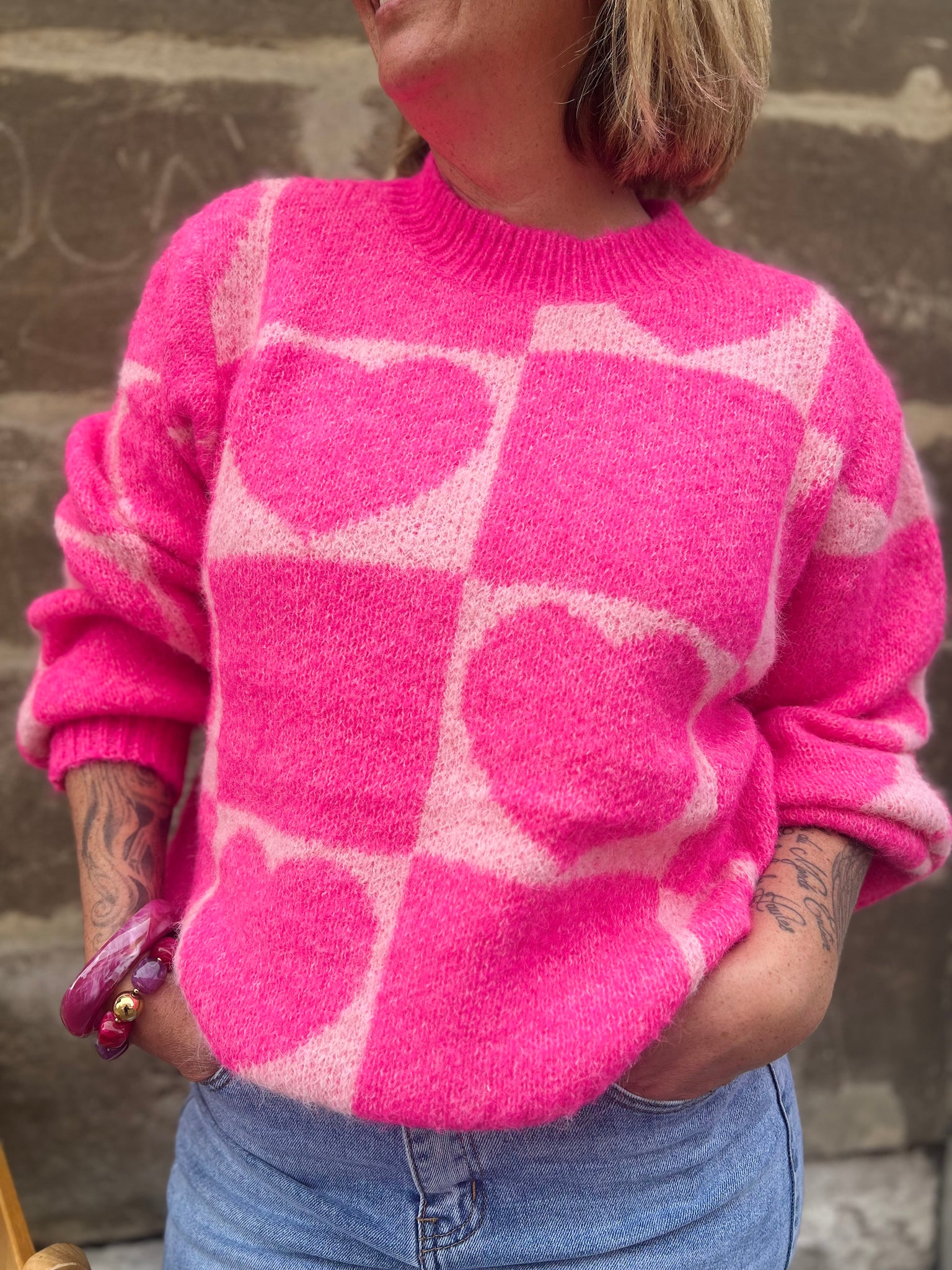 Pull tout doux, col Ron, motifs coeurs.