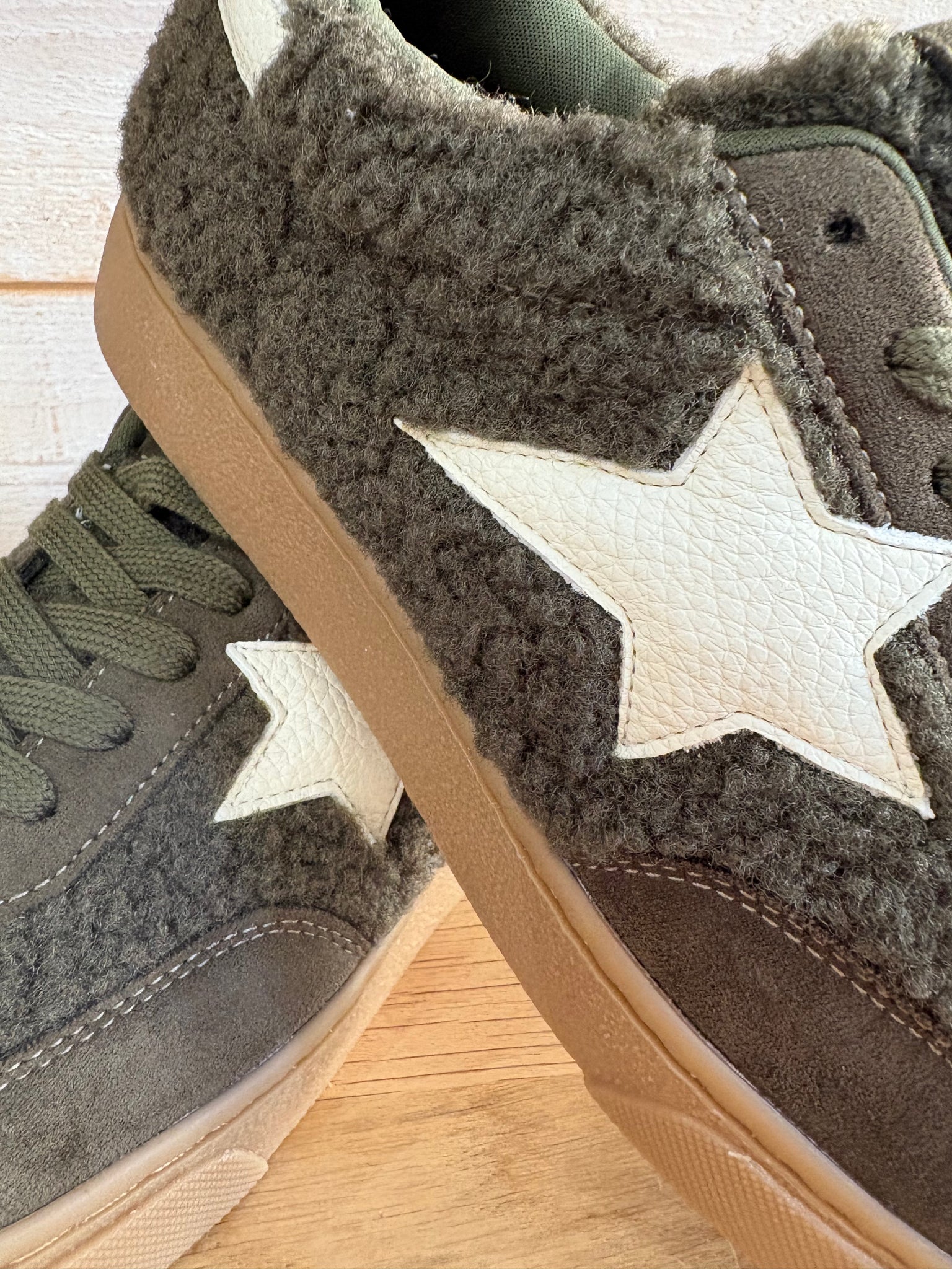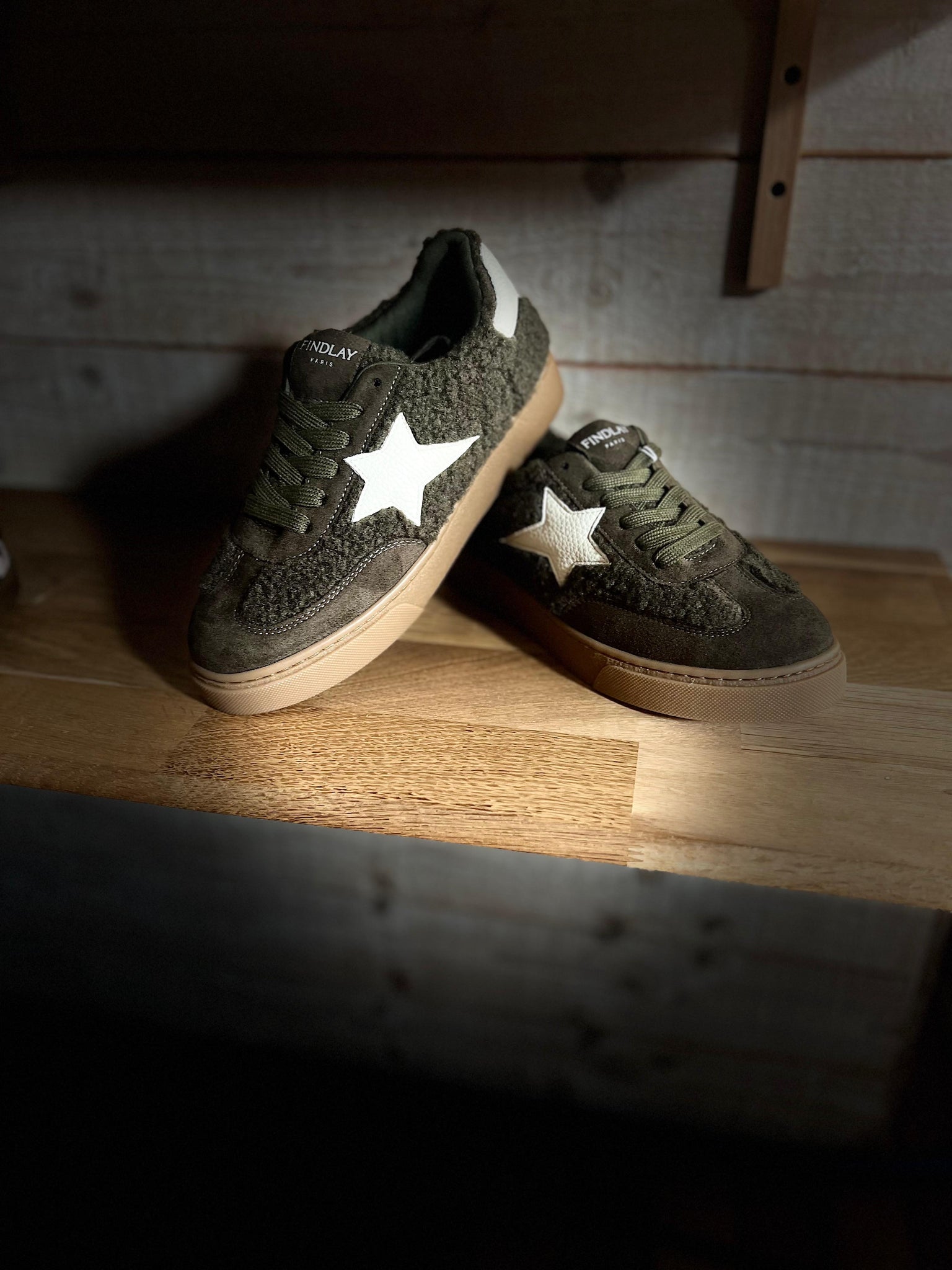 Baskets kaki, effet bouclette et daim, détail étoile blanche sur le côté.