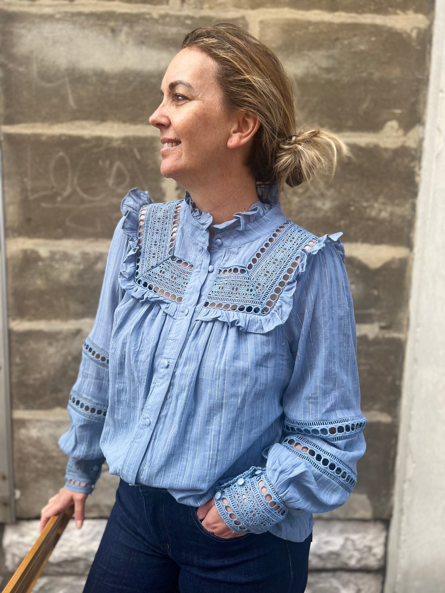 Blouse col volante, bleu ciel, rayures argent, détails brodés sur le devant.