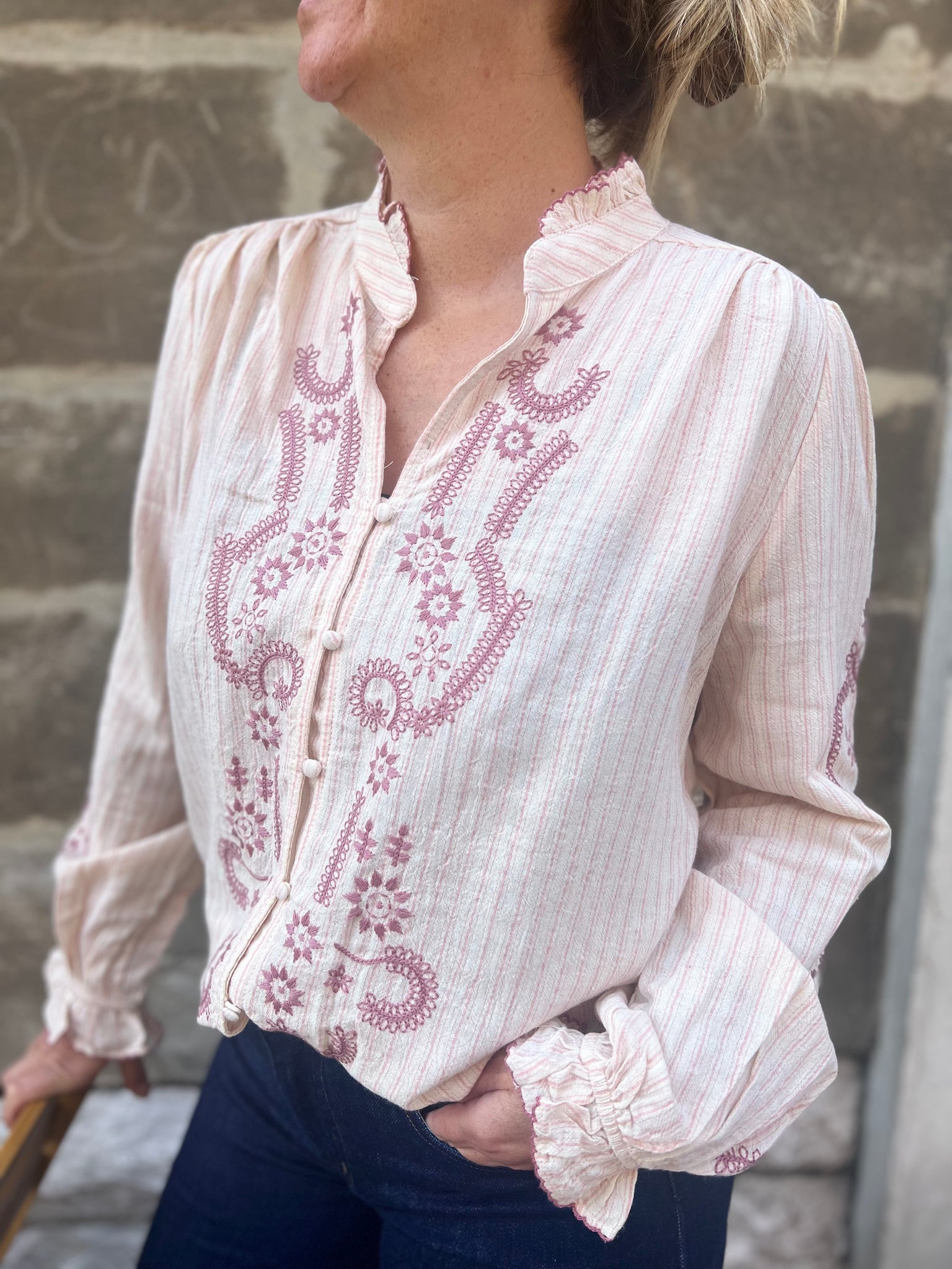 Blouse col volante, rayures rose clair sur fond blanc cassé, détails brodés aubergines sur le devant.