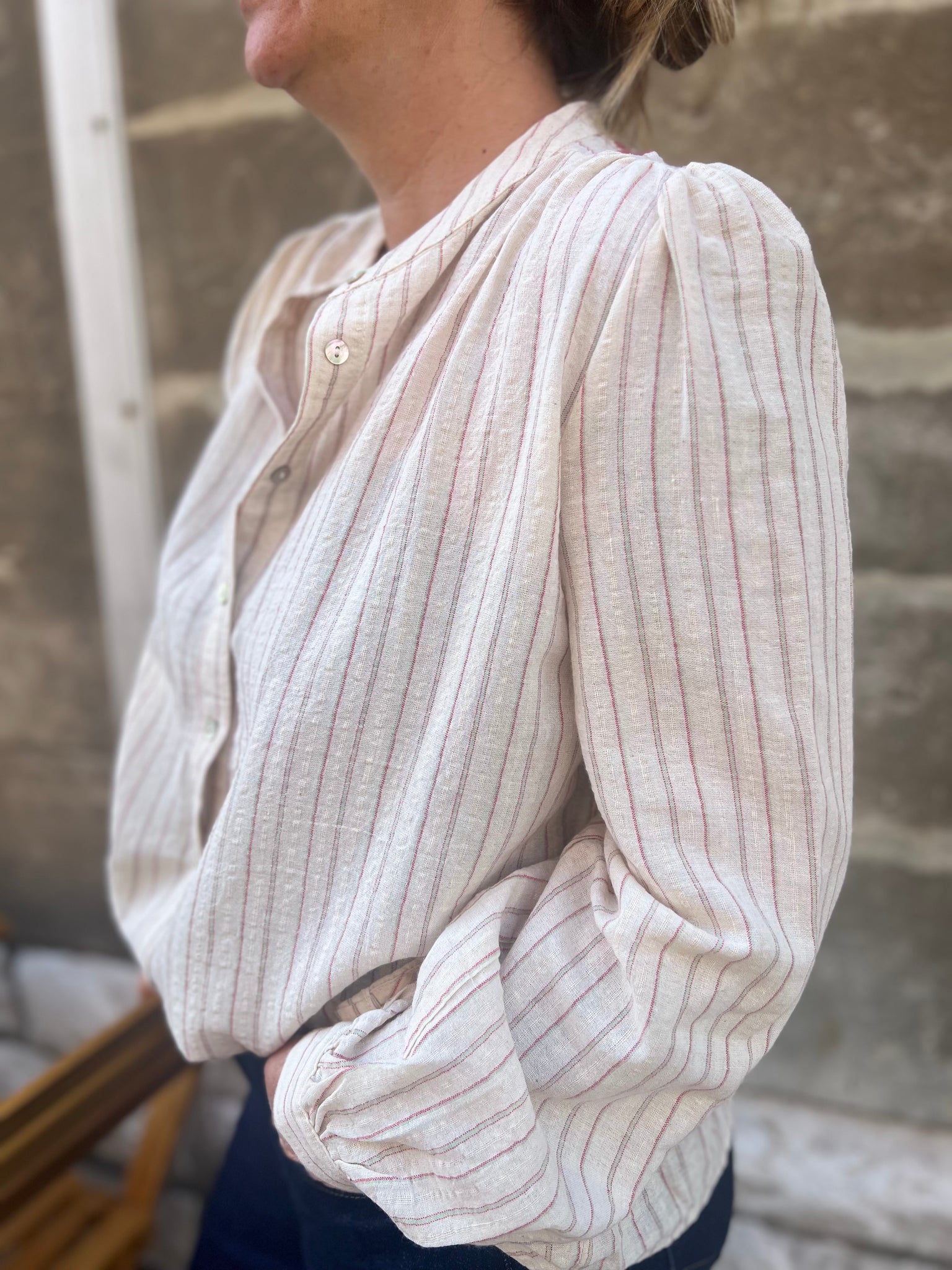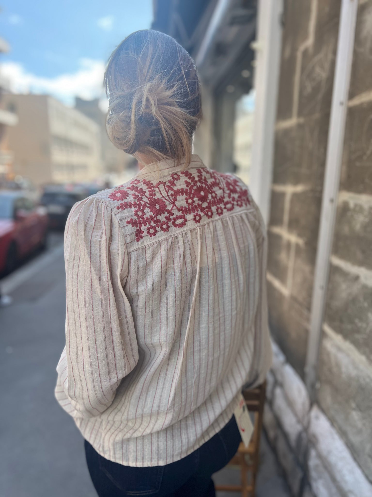 Blouse col mão, boutons nacrés, rayures grises et bordeaux (couleur tendance cette saison).